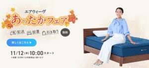 2025年11月12日(水)10:00~2026年1月4日(日)23:59まで、エアウィーヴのセール対象商品の配送・設置・引き取りが全て無料の【あったかフェア】が開催されています!