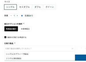 「完成品お届け」を選択 ⇒ 「寝具の引き取りを希望する」にチェック ⇒ 引取り製品を選択