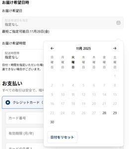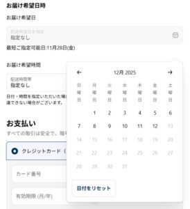 在庫品の場合は、「最短ご指定可能日」が自動表示された上で、購入日から約1カ月程度先までの日程を指定することが可能です。