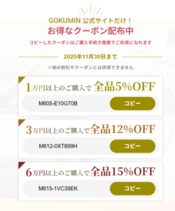 2025年11月30日(日)まで、GOKUMINのマットレス及び全商品最大15%OFFのクーポンキャンペーンが開催されています。