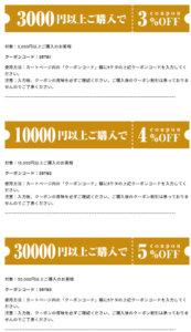 カートページ内の「クーポンコード」欄に入力することで、特別割引を受けることができます。