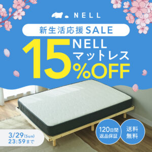 2026年3月2日(月)10時00分~3月29日(日)23時59分まで、NELLマットレス&NELLボックスシーツ&NELLまくら&NELLまくらカバー&NELL置くだけ敷きパッド他商品全サイズ対象15%OFFの新生活応援セールが開始されました。