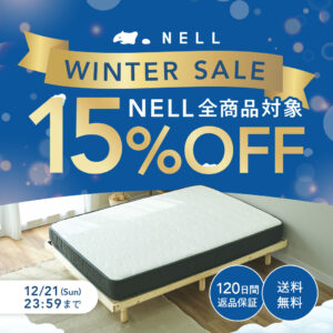 2025年12月7日(日)10時00分~12月21日(日)23時59分まで、NELLマットレス&NELLボックスシーツ&NELLまくら&NELLまくらカバー&NELL置くだけ敷きパッド他商品全サイズ対象15%OFFのWINTERセールが開始されました。